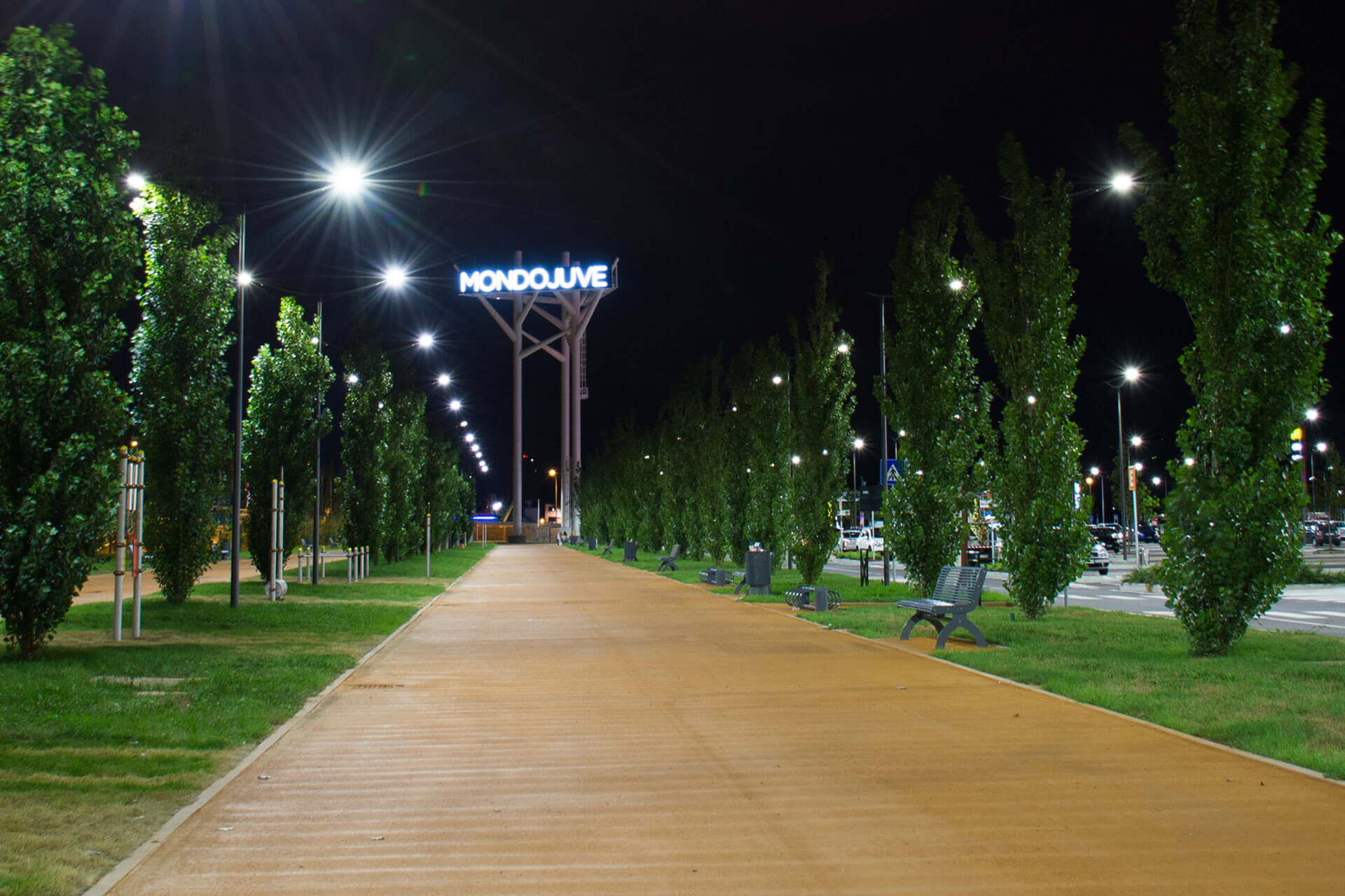 Para incentivar a mobilidade verde uma ciclovia arborizada liga o MondoJuve ao Chalé de Caça Stupinigi.