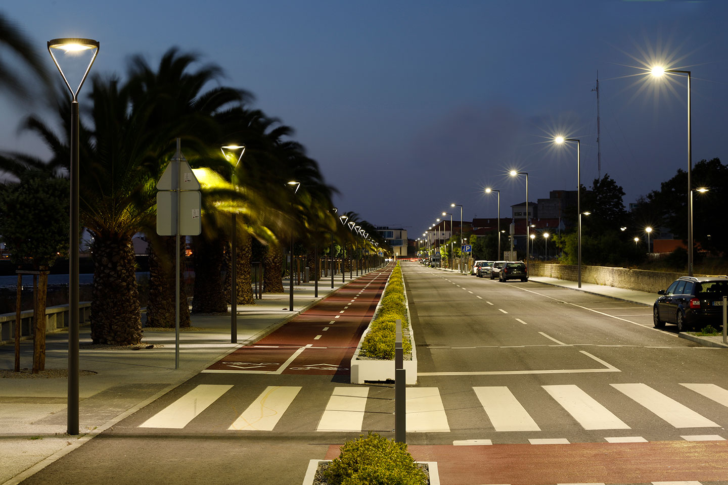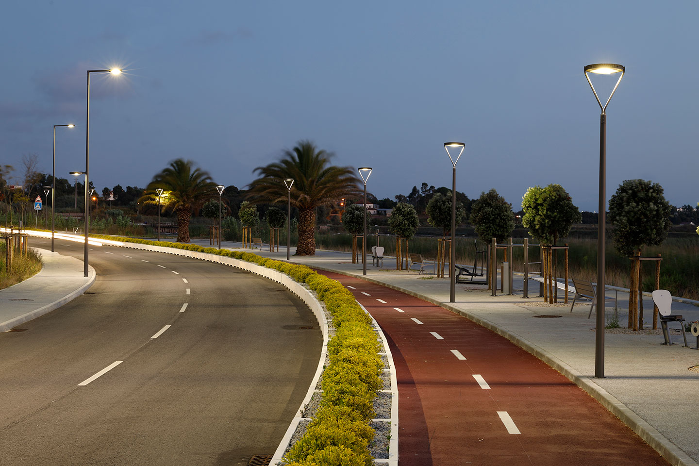 Para dar resposta a estes requisitos foi selecionada a moderna luminária YOA equipada com LEDs branco quente. No lado da ciclovia as YOA foram montadas a 4 metros com os braços LYRE formando um elegante conjunto que encaminha os ciclistas e os peões em total segurança e conforto ao longo de todo o percurso. Por sua vez, no lado da estrada as YOA foram instaladas a uma altura útil de 8 metros em braço lateral. Para iluminar o passeio do lado do campus universitário foram instaladas luminárias YOA a 4m nas mesmas colunas utilizadas para a iluminação da estrada.