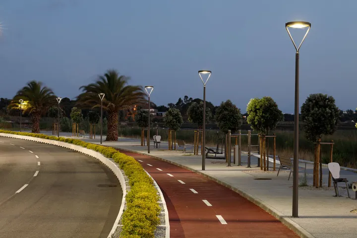As elegantes e eficientes luminárias YOA criam um espaço coeso e contínuo de circulação automóvel, pedonal e ciclável