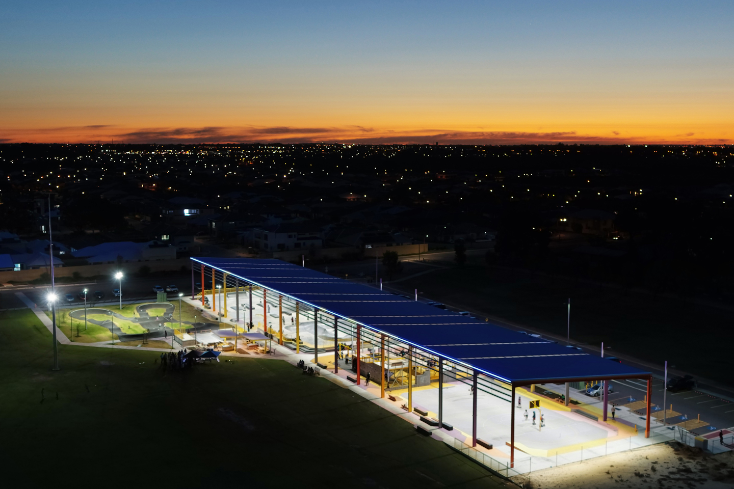 Foram também instalados mais de 140 metros de projetores lineares RHINO na estrutura do abrigo, tornando-o na primeira praça juvenil totalmente coberta na área metropolitana de Perth, permitindo a utilização durante todo o ano. Estes projetores possuem capacidade completa RGBW e são controlados pelo protocolo DMX, criando espetáculos de luz dinâmicos e cenários pré-programados para eventos ou épocas especiais. A iluminação reforça a identidade do espaço e cria uma atmosfera vibrante à noite.