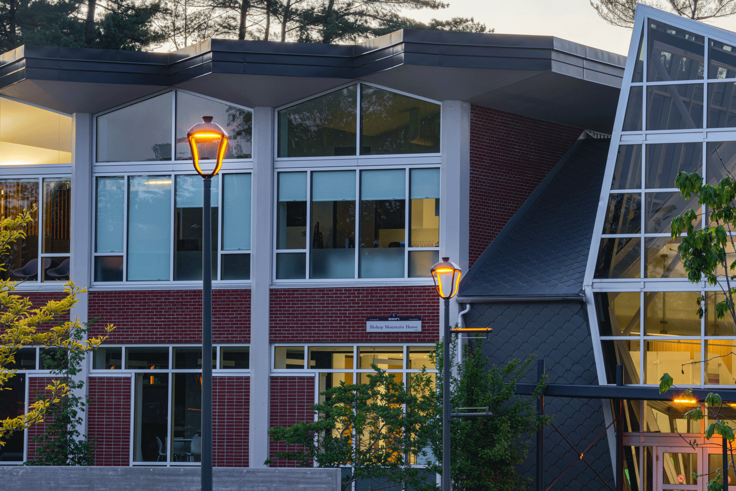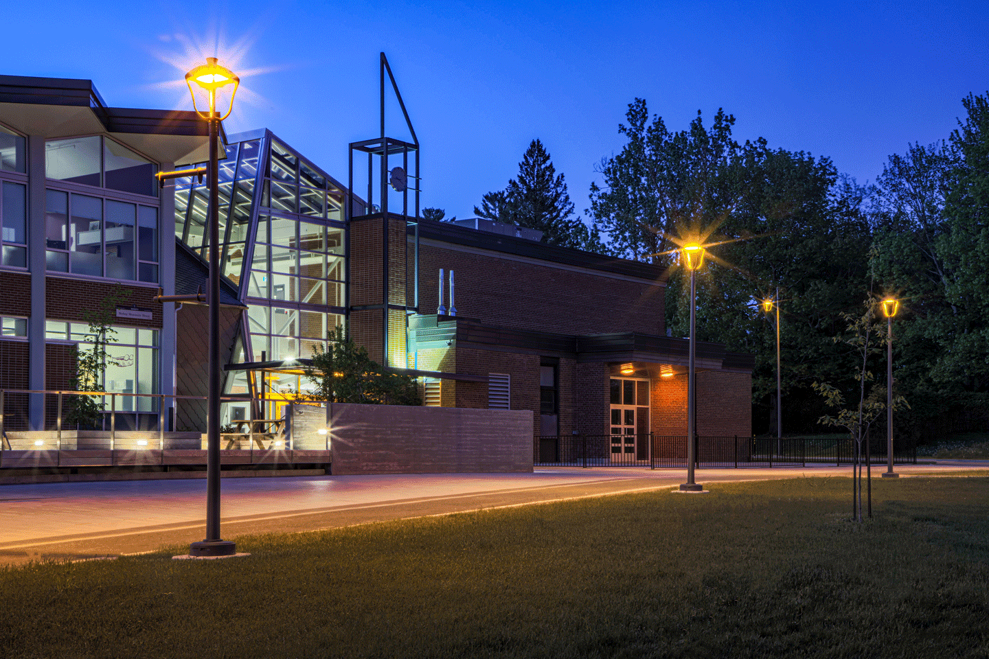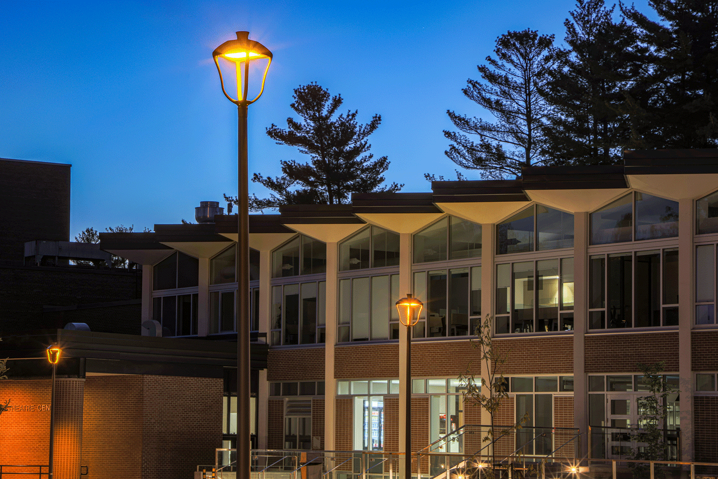 Esta moderna lanterna fornece LED um design sofisticado que realça a história do campus e, mais importante, está equipada com ótica de vidro plano que impede qualquer derrame de luz ascendente reduzindo a poluição luminosa para fornecer uma iluminação amiga do Céu Escuro.